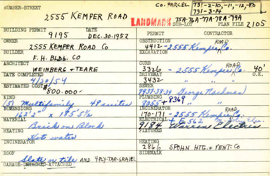 2555 Kemper Road Shaker Heights, OH 44120 PARCEL ID: 731-02-010 Building Permit Date: 12-30-1952 Plan File Number: 1850 scanned, 2105 Microfilm Roll: Roll027, Roll#32 Neighborhood: Boulevard Owner: 2555 Kemper Road Company Builder: F. H. Building Company Architect: Weinberg and Teare Estimated Cost: 800000 Date Completed: 04-30-1954 Kind: Apartment or Multi-family (3+) Material: Brick on Block Heating: Hot Water Roof: Slate, tar & gravel Garage: attached |