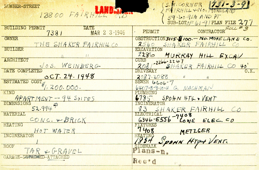 13800 Fairhill Road Shaker Heights, OH 44120 PARCEL ID: 731-03-009 Building Permit Date: 03-23-1946 Plan File Number: 277 all scanned Microfilm Roll: Roll003 Neighborhood: Boulevard Owner: The Shaker Fairhill Company Builder: The Shaker Fairhill Company Architect: Weinberg, Joseph Estimated Cost: 1200000 Date Completed: 10-24-1948 Kind: Apartment or Multi-family (3+) Material: Concrete and Brick Heating: Hot Water Garage: attached Blueprints: online, see link above |