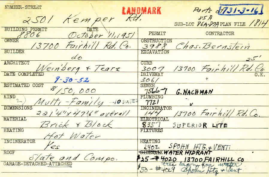 2501 Kemper Road Shaker Heights, OH 44120 PARCEL ID: 731-03-016 See also building card record for 13680 Fairhill Building Permit Date: 10-11-1951 Plan File Number: 1814 all scanned Microfilm Roll: Roll027 Neighborhood: Boulevard Owner: 13700 Fairhill Road Company Builder: 13700 Fairhill Road Company Architect: Weinberg and Teare Estimated Cost: 150000 Date Completed: 09-30-1952 Kind: Apartment or Multi-family (3+) Material: Brick and Block Heating: Hot Water Roof: Slate Garage: attached Blueprints: online, see link above |