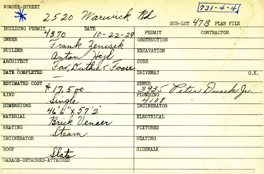 2520 Warwick Road Shaker Heights, OH 44120 PARCEL ID: 731-04-004 Building Permit Date: 10-22-1929 Neighborhood: Boulevard Owner: Zenisek, Frank Builder: Hejl, Anton Architect: Fox, Duthie and Foose Estimated Cost: 17500 Kind: Single, Single Residence or Dwelling Material: Brick Veneer Heating: Steam Roof: Slate Blueprints: no blueprints on microfilm |