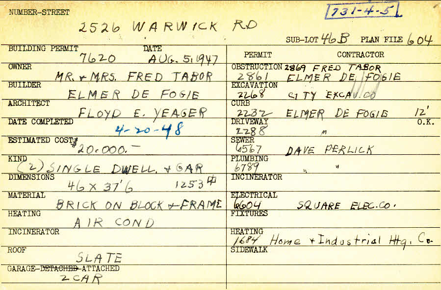 2526 Warwick Road Shaker Heights, OH 44120 PARCEL ID: 731-04-005 Building Permit Date: 08-05-1947 Plan File Number: 604, 1353, 1789 all scanned Microfilm Roll: Roll008, Roll016, Roll027 Owner: Tabor, Mr. and Mrs. Fred Builder: De Fogie, Elmer Architect: Yeager, Floyd E. Estimated Cost: 20000 Date Completed: 04-20-1948 Kind: Single Dwelling and Garage (2) Material: Brick on Block and Frame Heating: Air Conditioned Roof: Slate Garage: attached 2 car |