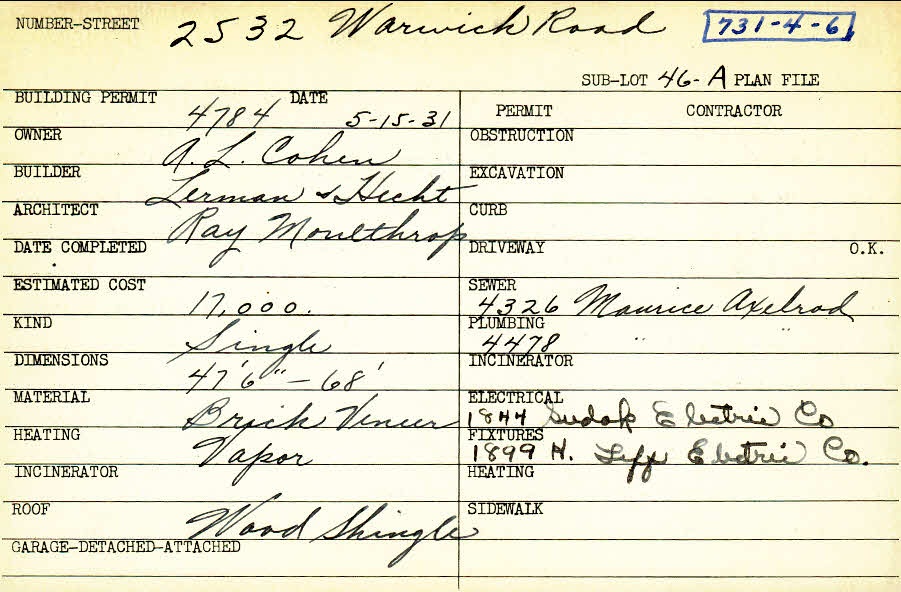 2532 Warwick Road Shaker Heights, OH 44120 PARCEL ID: 731-04-006 Building Permit Date: 05-15-1931 Neighborhood: Boulevard Owner: Cohen, A. L. Builder: Lerman and Hecht Architect: Moulthrop, Ray Estimated Cost: 17000 Kind: Single, Single Residence or Dwelling Material: Brick Veneer Heating: Vapor Roof: Wood Shingle Blueprints: no blueprints on microfilm |