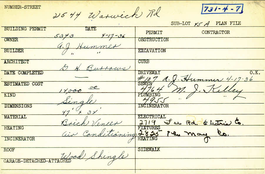 2544 Warwick Road Shaker Heights, OH 44120 PARCEL ID: 731-04-007 Building Permit Date: 04-17-1936 Neighborhood: Boulevard Owner: Hummer, A. J. Builder: Hummer, A. J. Architect: Burrows, George Howard Estimated Cost: 12000 Kind: Single, Single Residence or Dwelling Material: Brick Veneer Heating: Air Conditioned Roof: Wood Shingle Blueprints: no blueprints on microfilm |