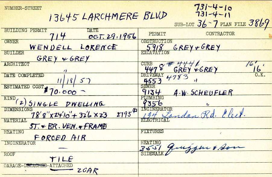 13645 Larchmere Boulevard Shaker Heights, OH 44120 PARCEL ID: 731-04-011 Building Permit Date: 10-29-1956 Plan File Number: 3869 all scanned Microfilm Roll: Roll056 Neighborhood: Boulevard Owner: Lorence, Wendell Builder: Grey and Grey Architect: Grey and Grey Estimated Cost: 70000 Date Completed: 11-18-1957 Kind: Single, Single Residence or Dwelling (2) Material: Stone and Brick Veneer and Frame Heating: Forced Air Roof: Tile Garage: attached 2 car Card Available: Yes Blueprints: online, see link above |