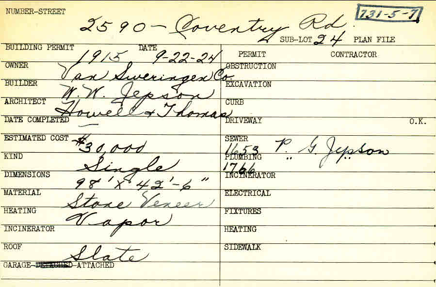 2590 Coventry Road Shaker Heights, OH 44120 PARCEL ID: 731-05-007 Building Permit Date: 09-22-1924 Plan File Number: 4887 Microfilm Roll: Roll#67 Neighborhood: Boulevard Owner: Van Sweringen Company Builder: Jepson, W. W. Architect: Howell and Thomas Estimated Cost: 30000 Kind: Single, Single Residence or Dwelling Material: Stone Veneer Heating: Vapor Roof: Slate Garage: attached |