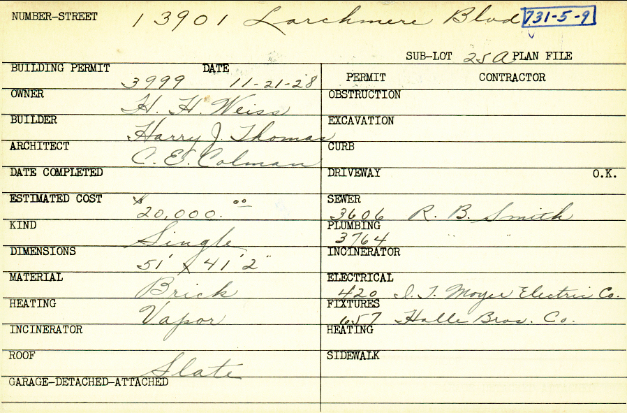 13901 Larchmere Boulevard Shaker Heights, OH 44120 PARCEL ID: 731-05-009 Building Permit Date: 11-21-1928 Neighborhood: Boulevard Owner: Weiss, H. H. Builder: Thomas, Harry J. Architect: Colman, Charles C. Estimated Cost: 20000 Kind: Single, Single Residence or Dwelling Material: Brick Heating: Vapor Roof: Slate Blueprints: no blueprints on microfilm |