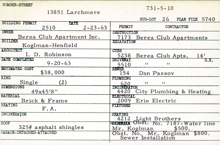 13851 Larchmere Boulevard Shaker Heights, OH 44120 PARCEL ID: 731-05-010 Building Permit Date: 02-23-1963 Plan File Number: 5740 Microfilm Roll: Roll#77 Neighborhood: Boulevard Owner: Berea Club Apartment Inc. Builder: Koglman - Henfield Architect: Robinson, I. D. Estimated Cost: 38000 Date Completed: 09-20-1963 Kind: Single, Single Residence or Dwelling (2) Material: Brick and Frame Heating: Forced Air Roof: 325# Asphalt |