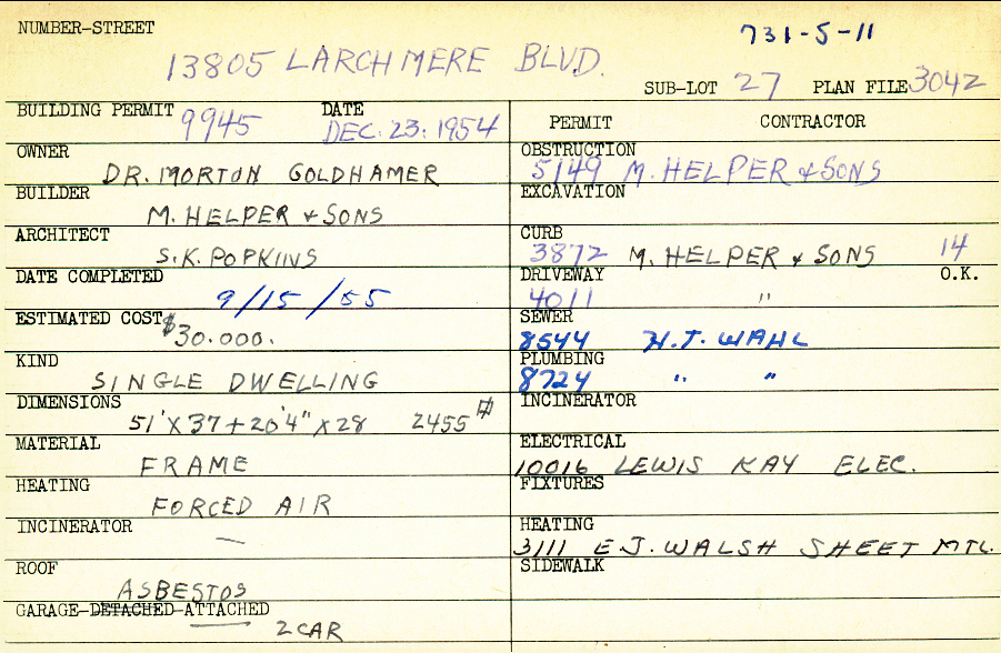 13805 Larchmere Boulevard Shaker Heights, OH 44120 PARCEL ID: 731-05-011 Building Permit Date: 12-23-1954 Plan File Number: 1147 scanned, 3042 Microfilm Roll: Roll014, Roll#43 Neighborhood: Boulevard Owner: Goldhamer, Dr. Morton Builder: M. Helper and Sons Architect: Popkins, S. K. Estimated Cost: 30000 Date Completed: 09-15-1955 Kind: Single, Single Residence or Dwelling Material: Frame Heating: Forced Air Roof: Asbestos Garage: attached 2 car |