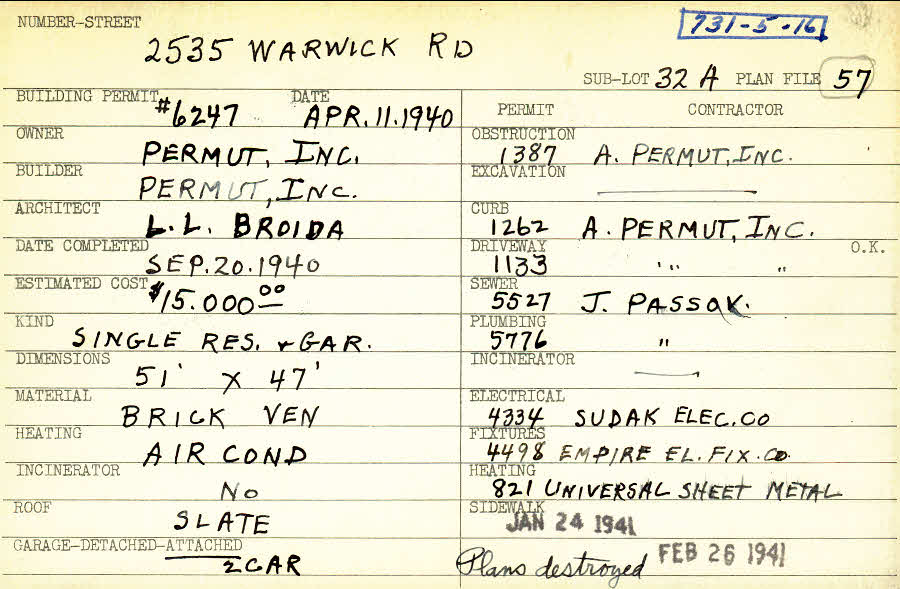 2535 Warwick Road Shaker Heights, OH 44120 PARCEL ID: 731-05-016 Building Permit Date: 04-11-1940 Plan File Number: 57, 7987 Microfilm Roll: Roll#95 Neighborhood: Boulevard Owner: Permut, Inc. Builder: Permut, Inc. Architect: Broida, L. L. Estimated Cost: 15000 Date Completed: 09-20-1940 Kind: Single Dwelling and Garage Material: Brick Veneer Heating: Air Conditioned Roof: Slate Garage: attached 2 car |