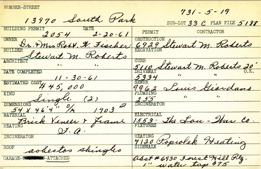 13970 South Park Boulevard Shaker Heights, OH 44120 PARCEL ID: 731-05-019 Building Permit Date: 02-20-1961 Plan File Number: 4859, 5188 Microfilm Roll: Roll#66, Roll#70 Neighborhood: Boulevard Owner: Fischer, Dr. and Mrs. Robert W. Builder: Roberts, Stewart M. Architect: Roberts, Stewart M. Estimated Cost: 45000 Date Completed: 11-30-1961 Kind: Single, Single Residence or Dwelling (2) Material: Brick Veneer and Frame Heating: Forced Air Roof: Asbestos Shingles Garage: attached |