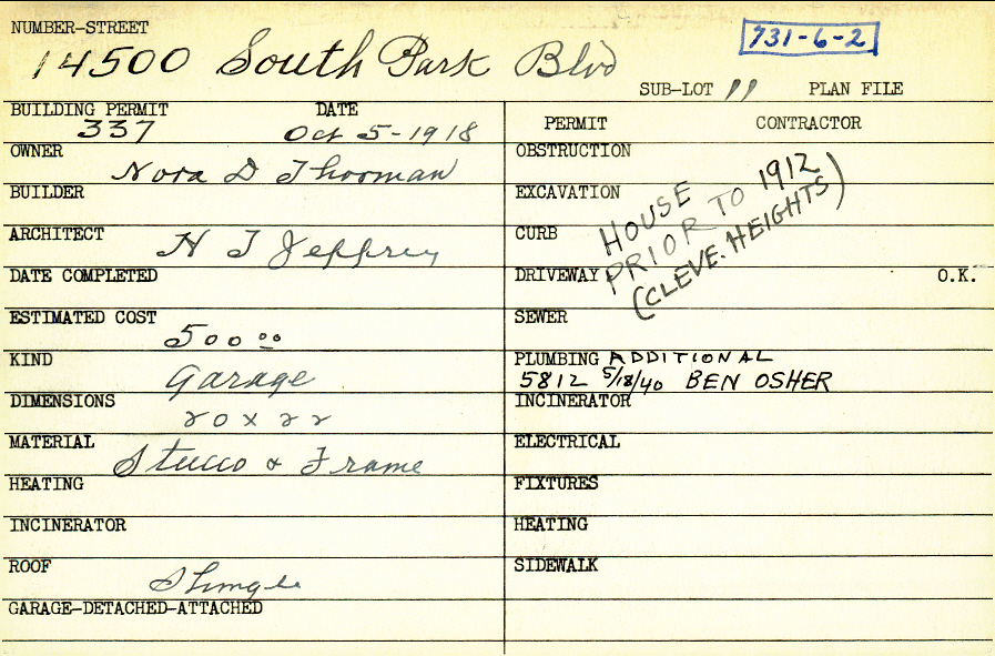 14500 South Park Boulevard Shaker Heights, OH 44120 PARCEL ID: 731-06-002 Building Permit Date: 10-05-1918 Plan File Number: 0 Neighborhood: Boulevard Owner: Thorman, Nora D. Architect: Jeffrey, H. T. Estimated Cost: 500 Material: Stucco and Frame Roof: Shingles |