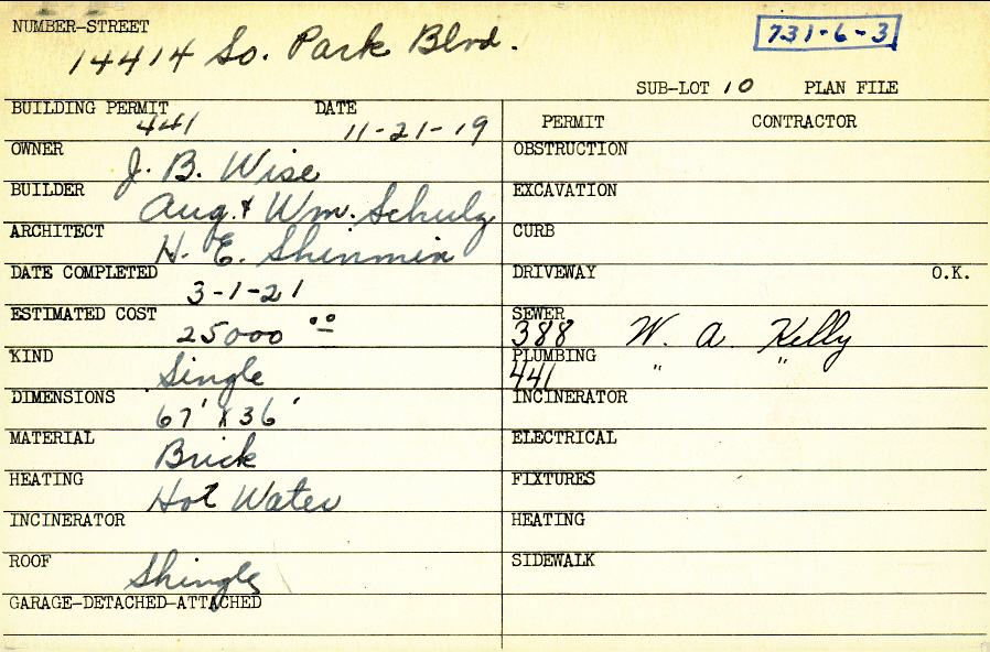 14414 South Park Boulevard Shaker Heights, OH 44120 PARCEL ID: 731-06-003 Building Permit Date: 11-21-1919 Plan File Number: 0 Neighborhood: Boulevard Owner: Wise, J. B. Builder: Schuly, August and William Architect: Shinmin, H. E. Estimated Cost: 25000 Date Completed: 03-01-1921 Kind: Single, Single Residence or Dwelling Material: Brick Heating: Hot Water Roof: Shingles |