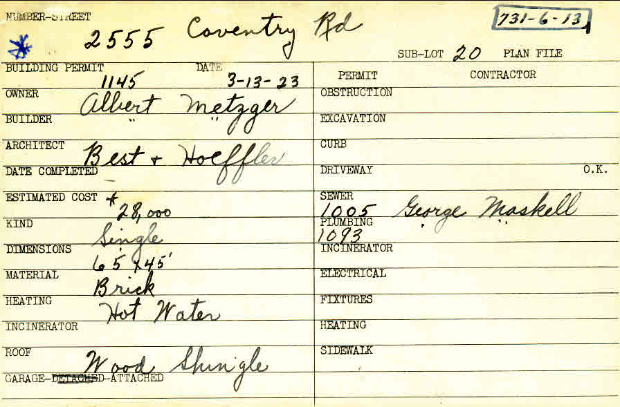 2555 Coventry Road Shaker Heights, OH 44120 PARCEL ID: 731-06-013 Building Permit Date: 03-13-1923 Plan File Number: 0 Neighborhood: Boulevard Owner: Metzger, Albert Builder: Metzger, Albert Architect: Best and Hoefler Estimated Cost: 28000 Kind: Single, Single Residence or Dwelling Material: Brick Heating: Hot Water Roof: Wood Shingle Garage: attached |