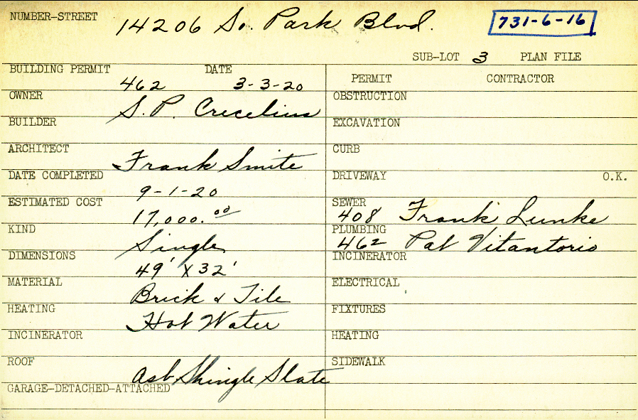 14206 South Park Boulevard Shaker Heights, OH 44120 PARCEL ID: 731-06-016 Building Permit Date: 03-03-1920 Plan File Number: 6591 Microfilm Roll: Roll#87 Neighborhood: Boulevard Owner: Crecelius, S. P. Architect: Smite, Frank Estimated Cost: 17000 Date Completed: 09-01-1920 Kind: Single, Single Residence or Dwelling Material: Brick and Tile Heating: Hot Water Roof: Asbestos Shingles |