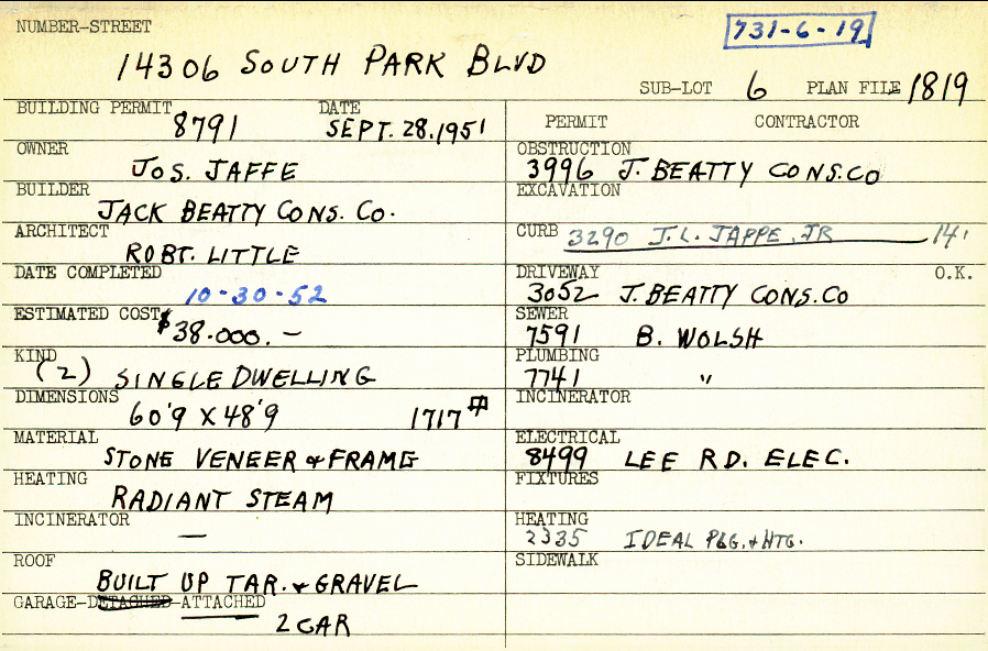 14306 South Park Boulevard Shaker Heights, OH 44120 PARCEL ID: 731-06-019 Building Permit Date: 09-28-1951 Plan File Number: 1819 scanned, 5378 Microfilm Roll: Roll027, Roll#73 Neighborhood: Boulevard Owner: Jaffe, Joseph Builder: Jack Beatty Construction Company Architect: Little, Robert Estimated Cost: 38000 Date Completed: 10-30-1952 Kind: Single, Single Residence or Dwelling (2) Material: Stone Veneer and Frame Heating: Steam Garage: attached 2 car |