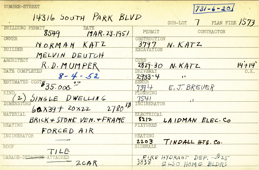 14316 South Park Boulevard Shaker Heights, OH 44120 PARCEL ID: 731-06-020 Building Permit Date: 03-23-1951 Plan File Number: 1573, 10005 Microfilm Roll: Roll#105 Neighborhood: Boulevard Owner: Katz, Norman Builder: Deutch, Melvin Architect: Mumper, R. D. Estimated Cost: 35000 Date Completed: 08-04-1952 Kind: Single, Single Residence or Dwelling (2) Material: Brick and Stone Veneer and Frame Heating: Forced Air Roof: Tile Garage: attached 2 car |