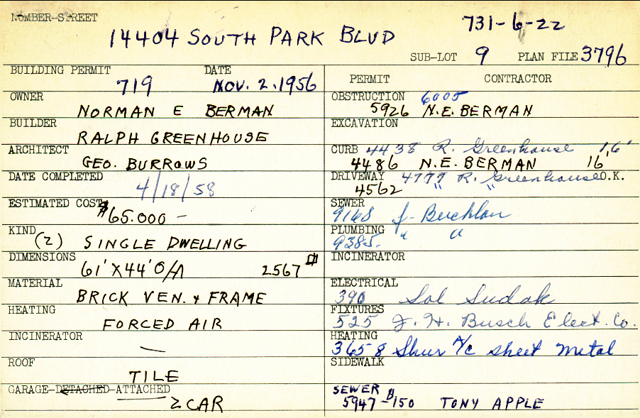 14404 South Park Boulevard Shaker Heights, OH 44120 PARCEL ID: 731-06-022 Building Permit Date: 11-02-1956 Plan File Number: 3796, 5920 Microfilm Roll: Roll#80 Neighborhood: Boulevard Owner: Berman, Norman E. Builder: Greenhouse, Ralph Architect: Burrows, George Estimated Cost: 65000 Date Completed: 04-18-1958 Kind: Single, Single Residence or Dwelling (2) Material: Brick Veneer and Frame Heating: Forced Air Roof: Tile Garage: attached 2 car |