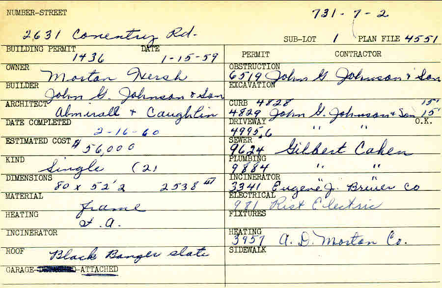 2631 Coventry Road Shaker Heights, OH 44120 PARCEL ID: 731-07-002 Building Permit Date: 01-15-1959 Plan File Number: 4551, 7362 Microfilm Roll: Roll#63, Roll#92 Neighborhood: Boulevard Owner: Hersh, Morton Builder: John G. Johnson and Son Architect: Almirall and Coughlin Estimated Cost: 56000 Date Completed: 02-16-1960 Kind: Single, Single Residence or Dwelling (2) Material: Frame Heating: Forced Air Roof: Slate Garage: attached |