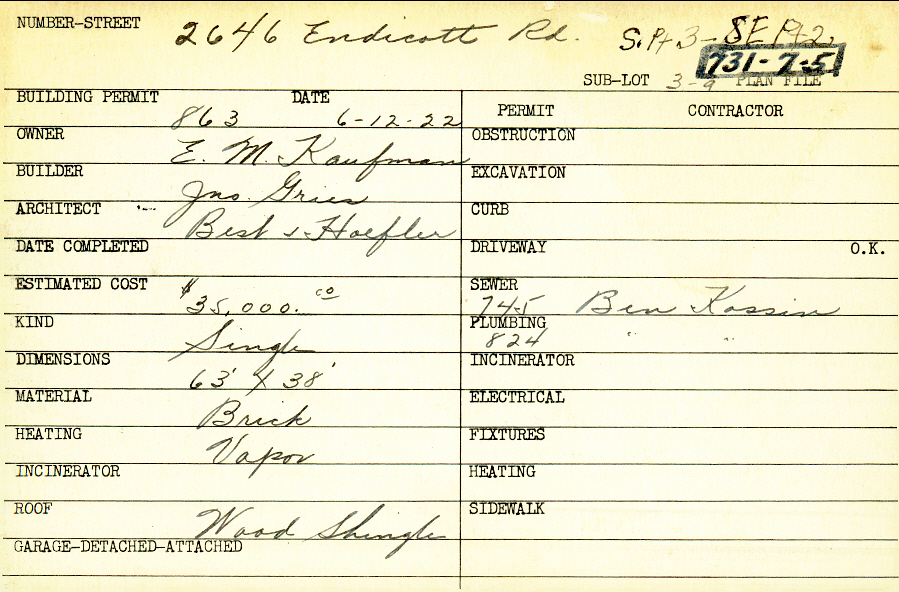 2646 Endicott Road Shaker Heights, OH 44120 PARCEL ID: 731-07-005 Building Permit Date: 06-12-1922 Plan File Number: 0 Neighborhood: Boulevard Owner: Kaufmann, E. M. Builder: Gries, John Architect: Best and Hoefler Estimated Cost: 35000 Kind: Single, Single Residence or Dwelling Material: Brick Heating: Vapor Roof: Wood Shingle |