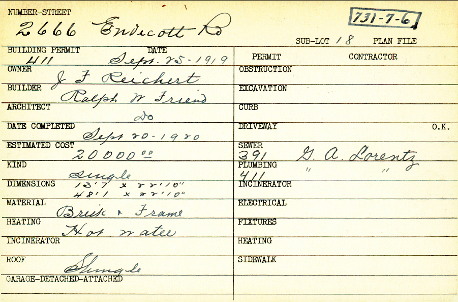 2666 Endicott Road Shaker Heights, OH 44120 PARCEL ID: 731-07-006 Building Permit Date: 09-25-1919 Plan File Number: 0 Neighborhood: Boulevard Owner: Reichert, J. F. Builder: Friend, Ralph W. Architect: Friend, Ralph W. Estimated Cost: 20000 Date Completed: 09-20-1920 Kind: Single, Single Residence or Dwelling Material: Brick and Frame Heating: Hot Water Roof: Shingles |