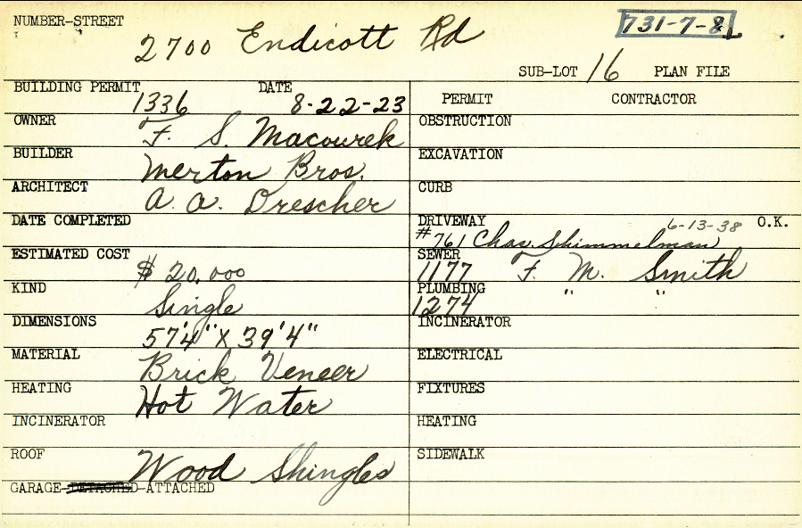 2700 Endicott Road Shaker Heights, OH 44120 PARCEL ID: 731-07-008 Building Permit Date: 08-22-1923 Plan File Number: 0 Neighborhood: Boulevard Owner: Macourek, F. S. Builder: Merton Brothers Architect: Drescher, A. A. Estimated Cost: 20000 Kind: Single, Single Residence or Dwelling Material: Brick Veneer Heating: Hot Water Roof: Wood Shingle Garage: attached |