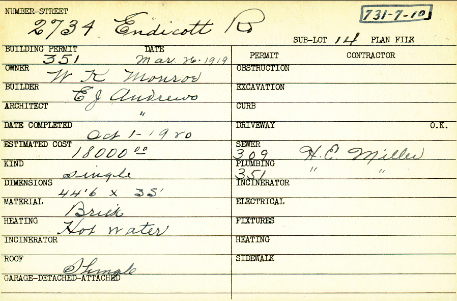 2734 Endicott Road Shaker Heights, OH 44120 PARCEL ID: 731-07-010 Building Permit Date: 03-26-1919 Plan File Number: 6331 Microfilm Roll: Roll#85 Neighborhood: Boulevard Owner: Monsor, W. K. Builder: Andrews, E. J. Architect: Andrews, E. J. Estimated Cost: 18000 Date Completed: 10-01-1920 Kind: Single, Single Residence or Dwelling Material: Brick Heating: Hot Water Roof: Shingles |
