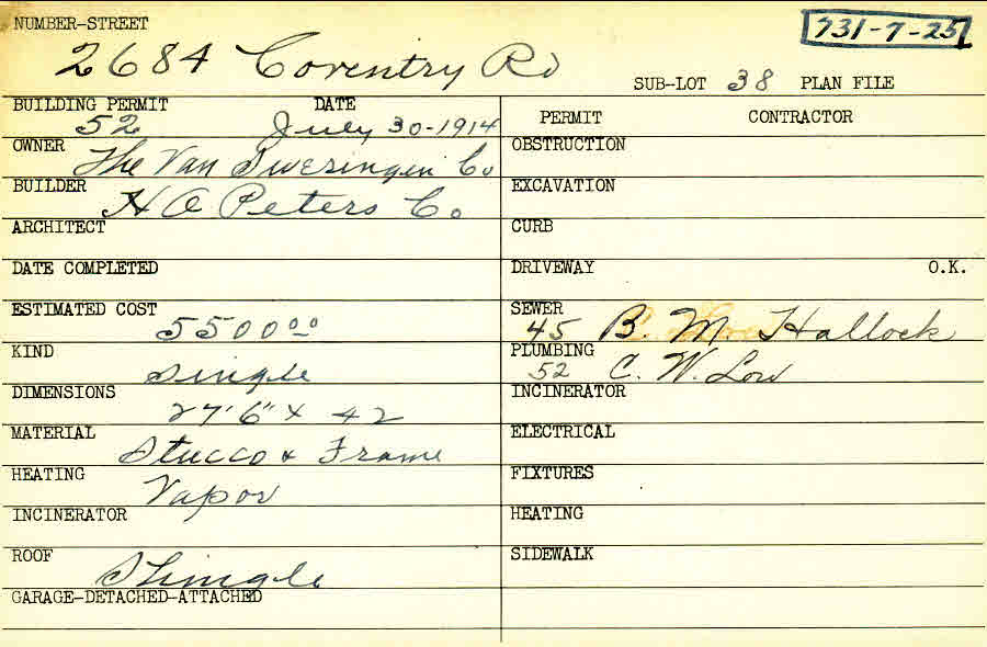 2684 Coventry Road Shaker Heights, OH 44120 PARCEL ID: 731-07-025 Building Permit Date: 07-30-1914 Plan File Number: 6124 Microfilm Roll: Roll#83 Neighborhood: Boulevard Owner: The Van Sweringen Company Builder: H. A. Peters Company Estimated Cost: 5500 Kind: Single, Single Residence or Dwelling Material: Stucco and Frame Heating: Vapor Roof: Shingles |