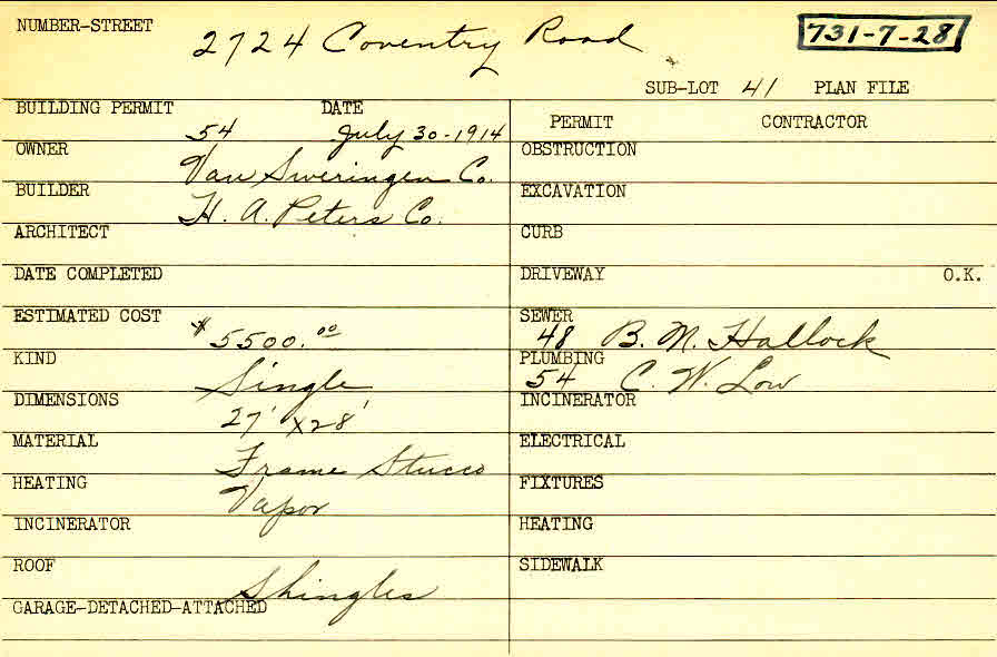 2724 Coventry Road Shaker Heights, OH 44120 PARCEL ID: 731-07-028 Building Permit Date: 07-30-1914 Plan File Number: 4251 all scanned Microfilm Roll: Roll062 Owner: The Van Sweringen Company Builder: H. A. Peters Company Estimated Cost: 5500 Kind: Single, Single Residence or Dwelling Material: Frame Stucco Heating: Vapor Roof: Shingles |