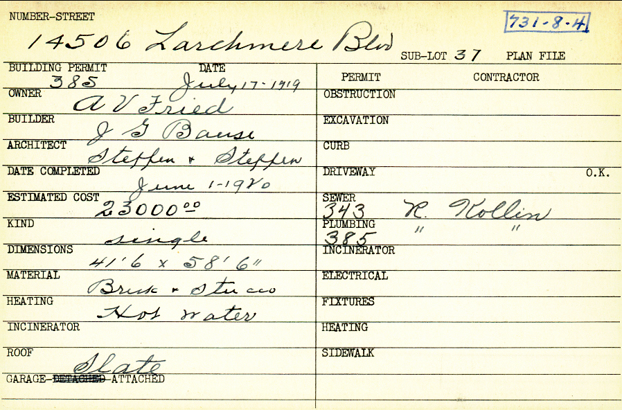 14506 Larchmere Boulevard Shaker Heights, OH 44120 PARCEL ID: 731-08-004 Building Permit Date: 07-17-1919 Plan File Number: 0 Neighborhood: Boulevard Owner: Fried, A. V. Builder: Bause, J. G. Architect: Steffen and Steffen Estimated Cost: 23000 Date Completed: 06-01-1920 Kind: Single, Single Residence or Dwelling Material: Brick and Stucco Heating: Hot Water Roof: Slate Garage: attached |