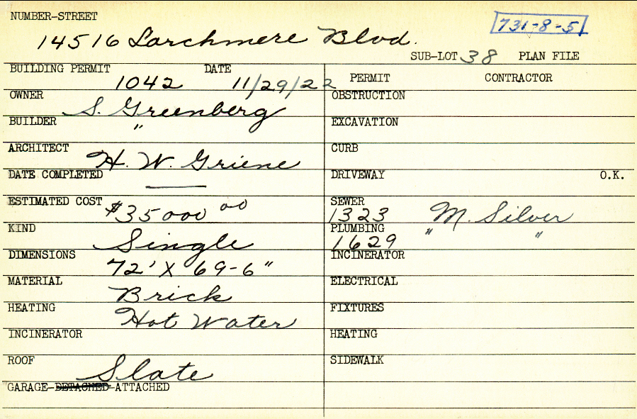 14516 Larchmere Boulevard Shaker Heights, OH 44120 PARCEL ID: 731-08-005 Building Permit Date: 11-29-1922 Plan File Number: 6274 Microfilm Roll: Roll#84 Neighborhood: Boulevard Owner: Greenberg, S. Builder: Greenberg, S. Architect: Griene, H. W. Estimated Cost: 35000 Kind: Single, Single Residence or Dwelling Material: Brick Heating: Hot Water Roof: Slate Garage: attached |