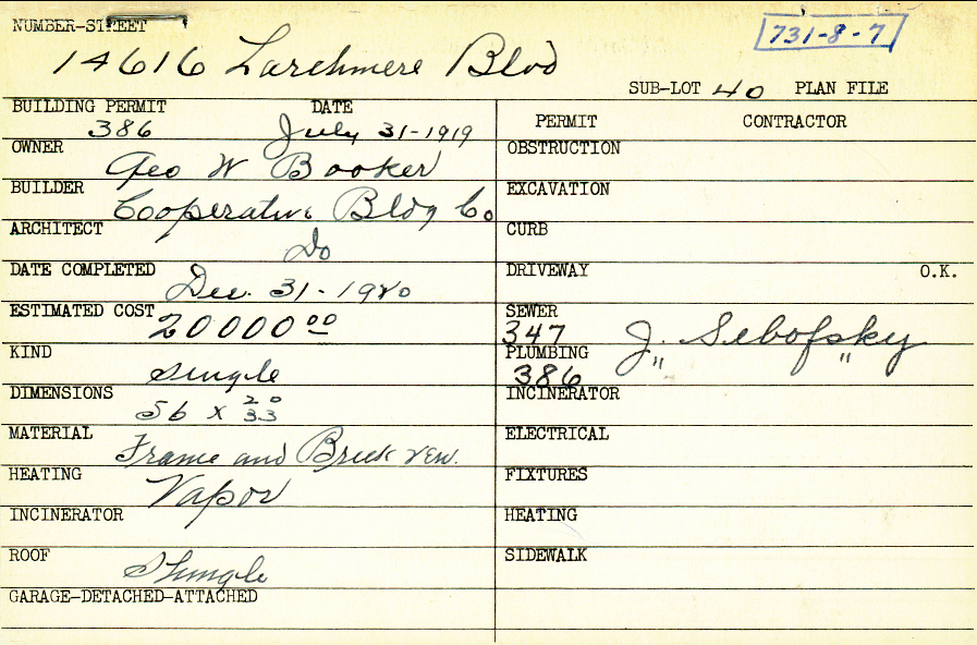 14616 Larchmere Boulevard Shaker Heights, OH 44120 PARCEL ID: 731-08-007 Building Permit Date: 07-31-1919 Plan File Number: 5879, 9130, 10142 all scanned Microfilm Roll: Roll079, Roll102, NewRoll02 Neighborhood: Boulevard Owner: Booker, George W. Builder: Cooperative Building Company Architect: Cooperative Building Company Estimated Cost: 20000 Date Completed: 12-31-1920 Kind: Single, Single Residence or Dwelling Material: Frame and Brick Veneer Heating: Vapor Roof: Shingles Blueprints: online, see link above |