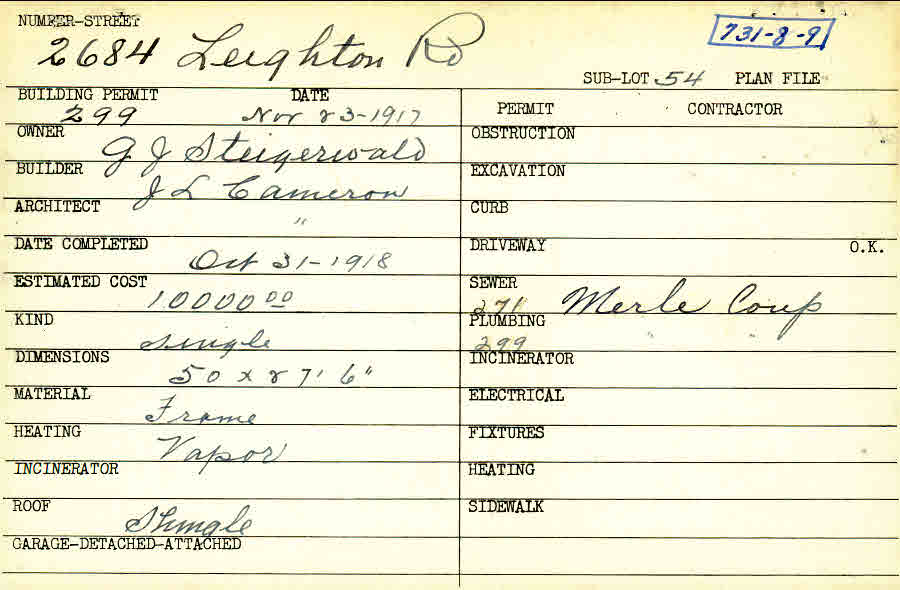 2684 Leighton Road Shaker Heights, OH 44120 PARCEL ID: 731-08-009 Building Permit Date: 11-23-1917 Plan File Number: 4382 scanned, 4696, 9733 Microfilm Roll: Roll062, Roll#65, Roll#104 Neighborhood: Boulevard Owner: Steigerwald, J. J. Builder: Cameron, J. L. Architect: Cameron, J. L. Estimated Cost: 10000 Date Completed: 10-31-1918 Kind: Single, Single Residence or Dwelling Material: Frame Heating: Vapor Roof: Shingles |