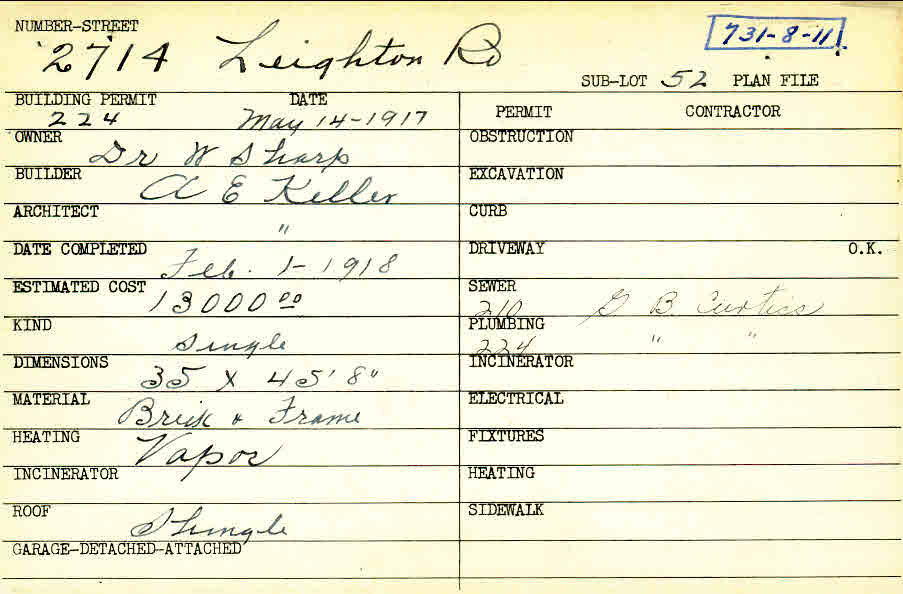 2714 Leighton Road Shaker Heights, OH 44120 PARCEL ID: 731-08-011 Building Permit Date: 05-14-1917 Plan File Number: 8315 Microfilm Roll: Roll#97 Neighborhood: Boulevard Owner: Sharp, Dr. W. Builder: Keller, A. E. Architect: Keller, Arthur Emil Estimated Cost: 13000 Date Completed: 02-01-1918 Kind: Single, Single Residence or Dwelling Material: Brick and Frame Heating: Vapor Roof: Shingles |