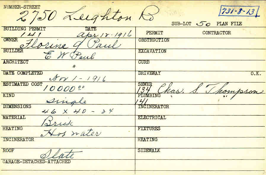 2750 Leighton Road Shaker Heights, OH 44120 PARCEL ID: 731-08-013 Building Permit Date: 04-12-1916 Plan File Number: 0 Neighborhood: Boulevard Owner: Paul, Florine G. Builder: Paul, E. W. Architect: Paul, E. W. Estimated Cost: 10000 Date Completed: 11-01-1916 Kind: Single, Single Residence or Dwelling Material: Brick Heating: Hot Water Roof: Slate Card Available: yes |