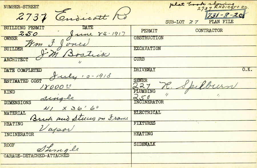 2737 Endicott Road Shaker Heights, OH 44120 PARCEL ID: 731-08-020 Building Permit Date: 06-25-1917 Plan File Number: 0 Neighborhood: Boulevard Owner: Jones, William F. Builder: Bostick, J. M. Architect: Bostick, J. M. Estimated Cost: 12000 Date Completed: 07-10-1918 Kind: Single, Single Residence or Dwelling Material: Birck and Stucco on Frame Heating: Vapor Roof: Shingles |