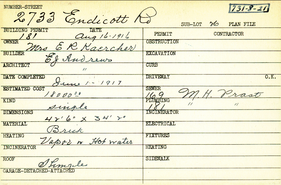 2733 Endicott Road Shaker Heights, OH 44120 PARCEL ID: 731-08-021 Building Permit Date: 08-16-1916 Plan File Number: 13082 all scanned Microfilm Roll: NewRoll19 Neighborhood: Boulevard Owner: Kaercher, Mrs. E. R. Builder: Andrews, E. J. Architect: Andrews, E. J. Estimated Cost: 18000 Date Completed: 06-01-1917 Kind: Single, Single Residence or Dwelling Material: Brick Heating: Vapor Roof: Shingles |