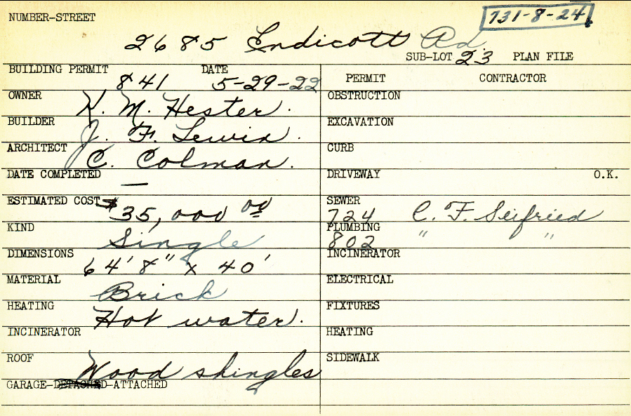 2685 Endicott Road Shaker Heights, OH 44120 PARCEL ID: 731-08-024 Building Permit Date: 05-29-1922 Neighborhood: Boulevard Owner: Hester, K. M. Builder: Lewin, J. F. Architect: Colman, Charles C. Estimated Cost: 35000 Kind: Single, Single Residence or Dwelling Material: Brick Heating: Hot Water Roof: Wood Shingle Garage: attached Card Available: Yes Blueprints: no blueprints on microfilm |