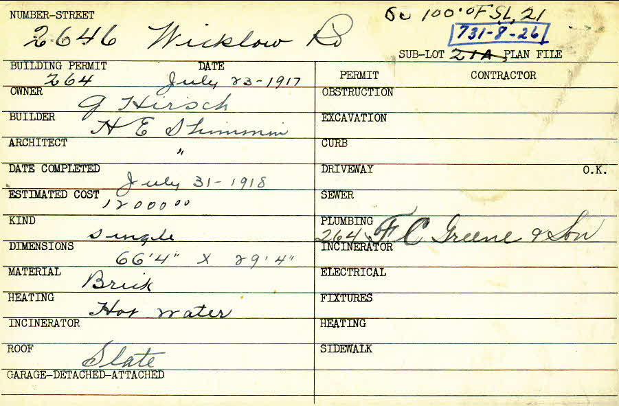 2646 Wicklow Road Shaker Heights, OH 44120 PARCEL ID: 731-08-026 Building Permit Date: 07-23-1917 Plan File Number: 3062, 10646 Microfilm Roll: Roll#43, NewRoll#5 Neighborhood: Boulevard Owner: Hirsch, J. Builder: Shimmin, H. E. Architect: Shimmin, H. E. Estimated Cost: 12000 Date Completed: 07-31-1918 Kind: Single, Single Residence or Dwelling Material: Brick Heating: Hot Water Roof: Slate |