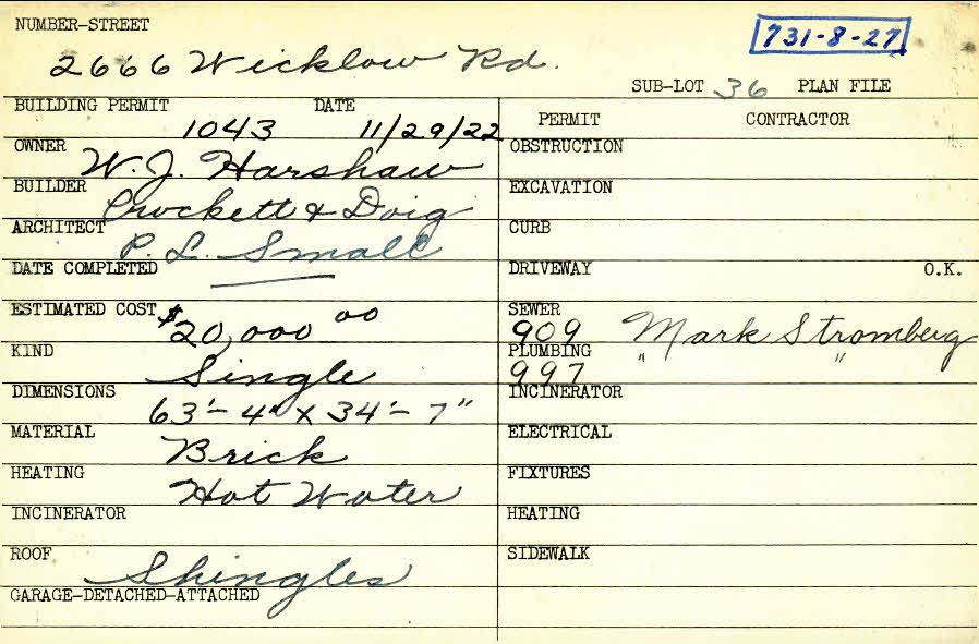 2666 Wicklow Road Shaker Heights, OH 44120 PARCEL ID: 731-08-027 Building Permit Date: 11-29-1922 Plan File Number: 6671 Microfilm Roll: Roll#87 Neighborhood: Boulevard Owner: Harshaw, W. J. Builder: Crockett and Doig Architect: Small, P. L. Estimated Cost: 20000 Kind: Single, Single Residence or Dwelling Material: Brick Heating: Hot Water Roof: Shingles |