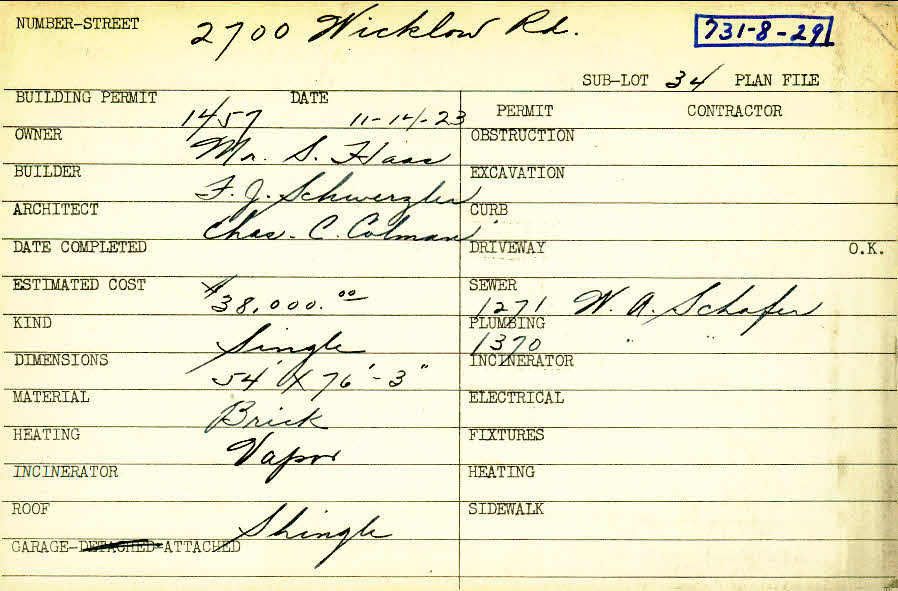 2700 Wicklow Road Shaker Heights, OH 44120 PARCEL ID: 731-08-029 Building Permit Date: 11-12-1923 Plan File Number: 0 Neighborhood: Boulevard Owner: Hass, Mr. S. Builder: Schwerzler, F. J. Architect: Colman, Charles C. Estimated Cost: 38000 Kind: Single, Single Residence or Dwelling Material: Brick Heating: Vapor Roof: Shingles Garage: attached |