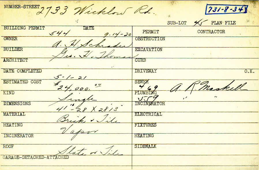 2733 Wicklow Road Shaker Heights, OH 44120 PARCEL ID: 731-08-034 Building Permit Date: 09-14-1920 Plan File Number: 0 Neighborhood: Boulevard Owner: Schrader, A. H. Builder: Thomas, George H. Estimated Cost: 24000 Date Completed: 05-01-1921 Kind: Single, Single Residence or Dwelling Material: Brick and Tile Heating: Vapor Roof: Slate |