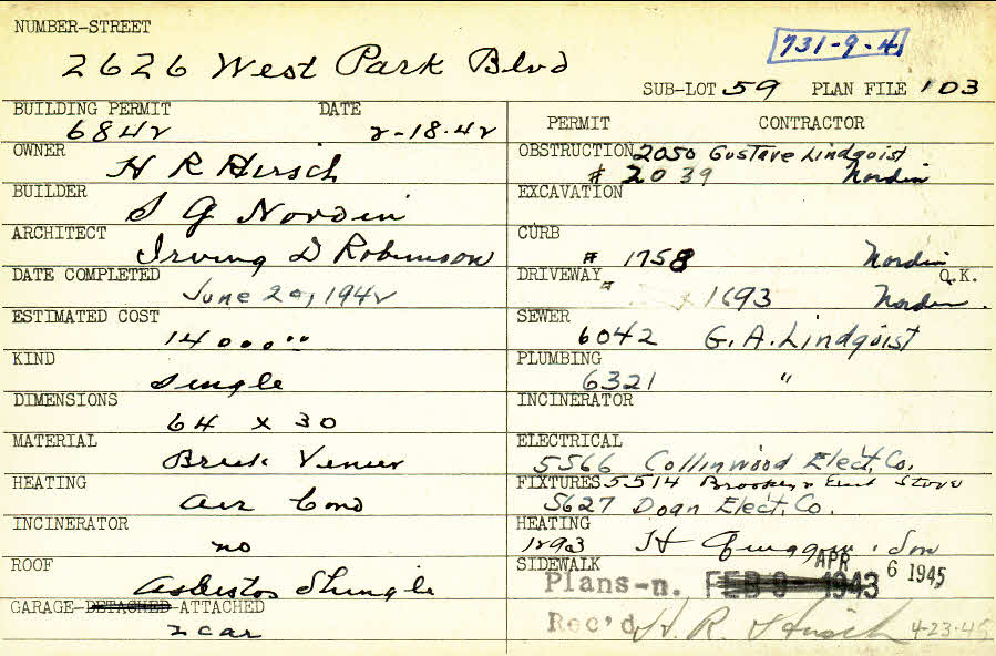2626 West Park Boulevard Shaker Heights, OH 44120 PARCEL ID: 731-09-004 Building Permit Date: 02-18-1942 Plan File Number: 34 scanned, 103, 4441 Microfilm Roll: Roll001, Roll#63 Owner: Hirsch, H. R. Builder: Nordin, S. G. Architect: Robinson, Irving D. Estimated Cost: 14000 Date Completed: 06-20-1942 Kind: Single, Single Residence or Dwelling Material: Brick Veneer Heating: Air Conditioned Roof: Asbestos Shingles Garage: attached 2 car |