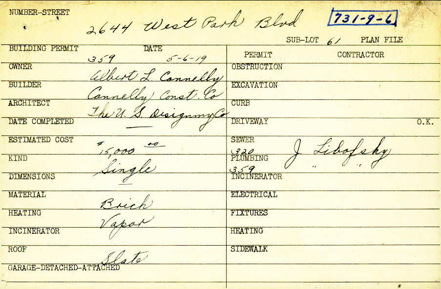 2644 West Park Boulevard Shaker Heights, OH 44120 PARCEL ID: 731-09-006 Building Permit Date: 05-06-1919 Plan File Number: 4765 Microfilm Roll: Roll#66 Neighborhood: Boulevard Owner: Connelly, Albert L. Builder: Connelly Construction Company Architect: The U. S. Designing Company Estimated Cost: 15000 Kind: Single, Single Residence or Dwelling Material: Brick Heating: Vapor Roof: Slate |