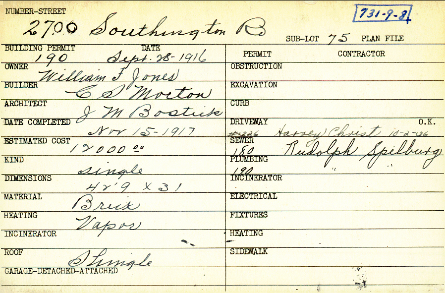 2700 Southington Road Shaker Heights, OH 44120 PARCEL ID: 731-09-008 Building Permit Date: 09-28-1916 Plan File Number: 0 Neighborhood: Boulevard Owner: Jones, William F. Builder: Morton, C. S. Architect: Bostick, J. M. Estimated Cost: 12000 Date Completed: 11-15-1917 Kind: Single, Single Residence or Dwelling Material: Brick Heating: Vapor Roof: Shingles |