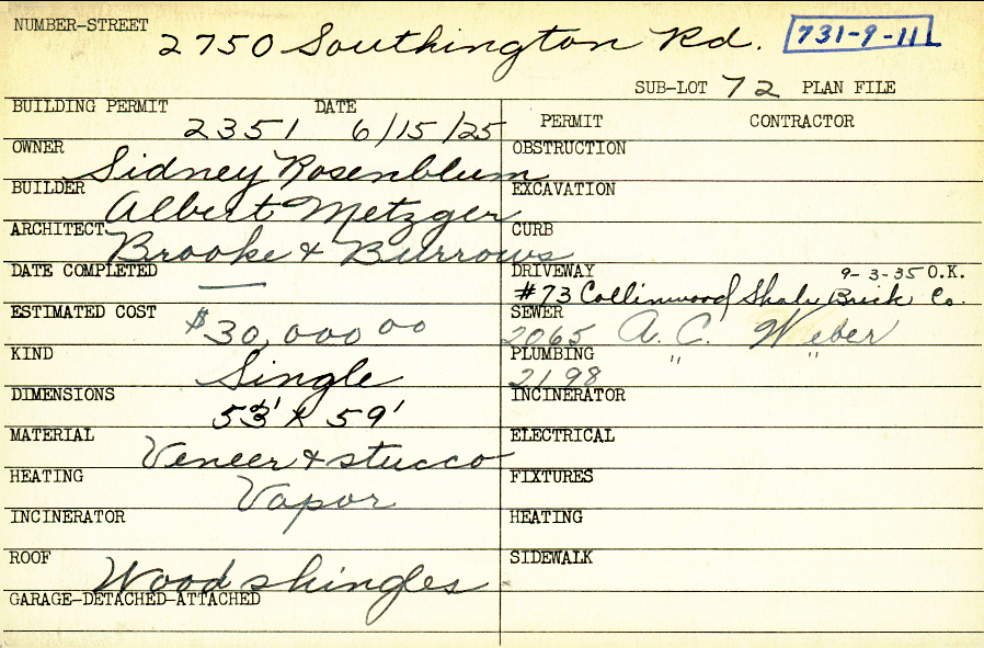2750 Southington Road Shaker Heights, OH 44120 PARCEL ID: 731-09-011 Building Permit Date: 06-15-1925 Plan File Number: 6337 Microfilm Roll: Roll#85 Neighborhood: Boulevard Owner: Rosenblum, Sidney Builder: Metzger, Albert Architect: Brooke and Burrows Estimated Cost: 30000 Kind: Single, Single Residence or Dwelling Material: Veneer and Stucco Heating: Vapor Roof: Wood Shingle |