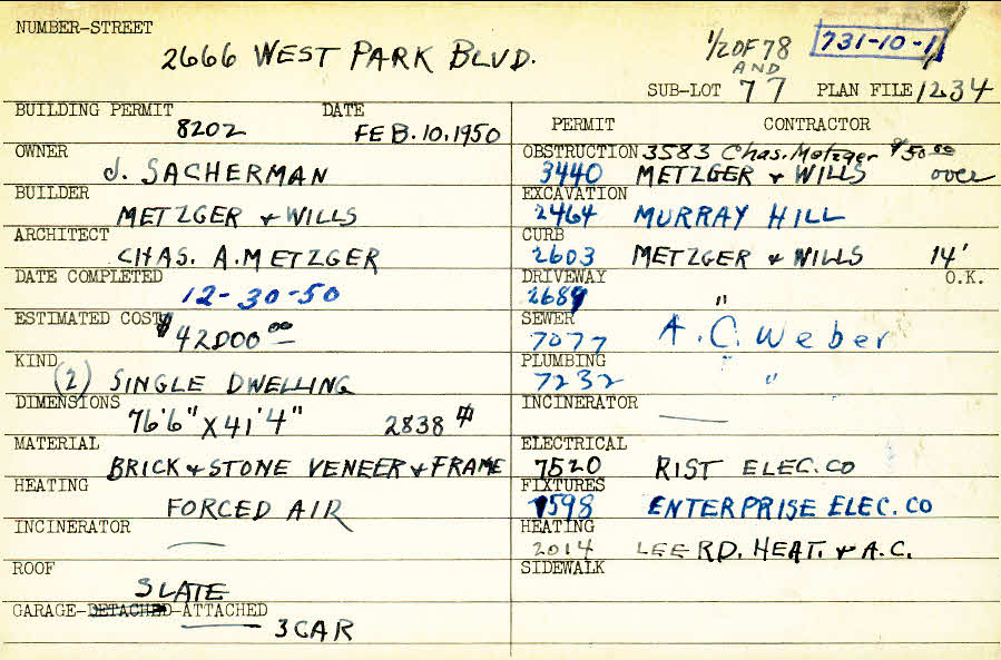 2666 West Park Boulevard Shaker Heights, OH 44120 PARCEL ID: 731-10-001 Building Permit Date: 02-10-1950 Plan File Number: 1234 scanned, 3500, 3894, 4223, 5207 Microfilm Roll: Roll015, Roll#51, Roll#57, Roll#61, Roll#72 Neighborhood: Boulevard Owner: Sacherman. J. Builder: Metzger and Wills Architect: Metzger, Charles A. Estimated Cost: 42000 Date Completed: 12-30-1950 Kind: Single, Single Residence or Dwelling (2) Material: Brick and Stone Veneer and Frame Heating: Forced Air Roof: Slate Garage: attached 3 car |