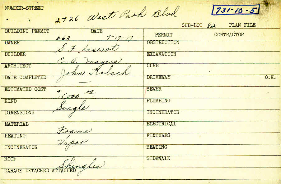 2726 West Park Boulevard Shaker Heights, OH 44120 PARCEL ID: 731-10-005 Building Permit Date: 07-17-1917 Plan File Number: 5720, 12804 Microfilm Roll: Roll#77, NewRoll#18 Neighborhood: Boulevard Owner: Haserot, S. F. Builder: Mayers, E. A. Architect: Kalsch, John Estimated Cost: 15000 Kind: Single, Single Residence or Dwelling Material: Frame Heating: Vapor Roof: Shingles |