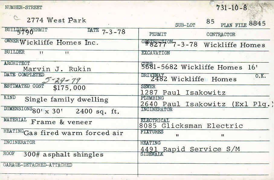2774 West Park Boulevard Shaker Heights, OH 44120 PARCEL ID: 731-10-008 Building Permit Date: 07-03-1978 Plan File Number: 8845* Microfilm Roll: Roll#98 Neighborhood: Boulevard Owner: Wickliffe Homes Inc. Builder: Wickliffe Homes Inc. Architect: Rukin, Marvin J. Estimated Cost: 175000 Date Completed: 05-29-1979 Kind: Single, Single Residence or Dwelling Material: Frame and veneer Heating: Forced Air - Gas Roof: 300# Min Asphalt |