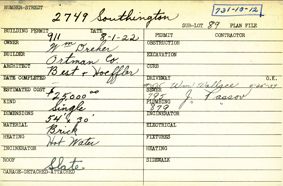 2749 Southington Road Shaker Heights, OH 44120 PARCEL ID: 731-10-012 Building Permit Date: 08-01-1922 Plan File Number: 0 Neighborhood: Boulevard Owner: Dreher, William Builder: Ortman Company Architect: Best and Hoefler Estimated Cost: 25000 Kind: Single, Single Residence or Dwelling Material: Brick Heating: Hot Water Roof: Slate |