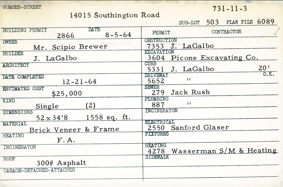 14015 Southington Road Shaker Heights, OH 44120 PARCEL ID: 731-11-003 Building Permit Date: 08-05-1964 Plan File Number: 6089 Microfilm Roll: Roll#81 Neighborhood: Ludlow Owner: Brewer, Mr. Scipio Builder: LaGalbo, J. Estimated Cost: 25000 Date Completed: 12-21-1964 Kind: Single, Single Residence or Dwelling (2) Material: Brick Veneer and Frame Heating: Forced Air Roof: 300# Min Asphalt |